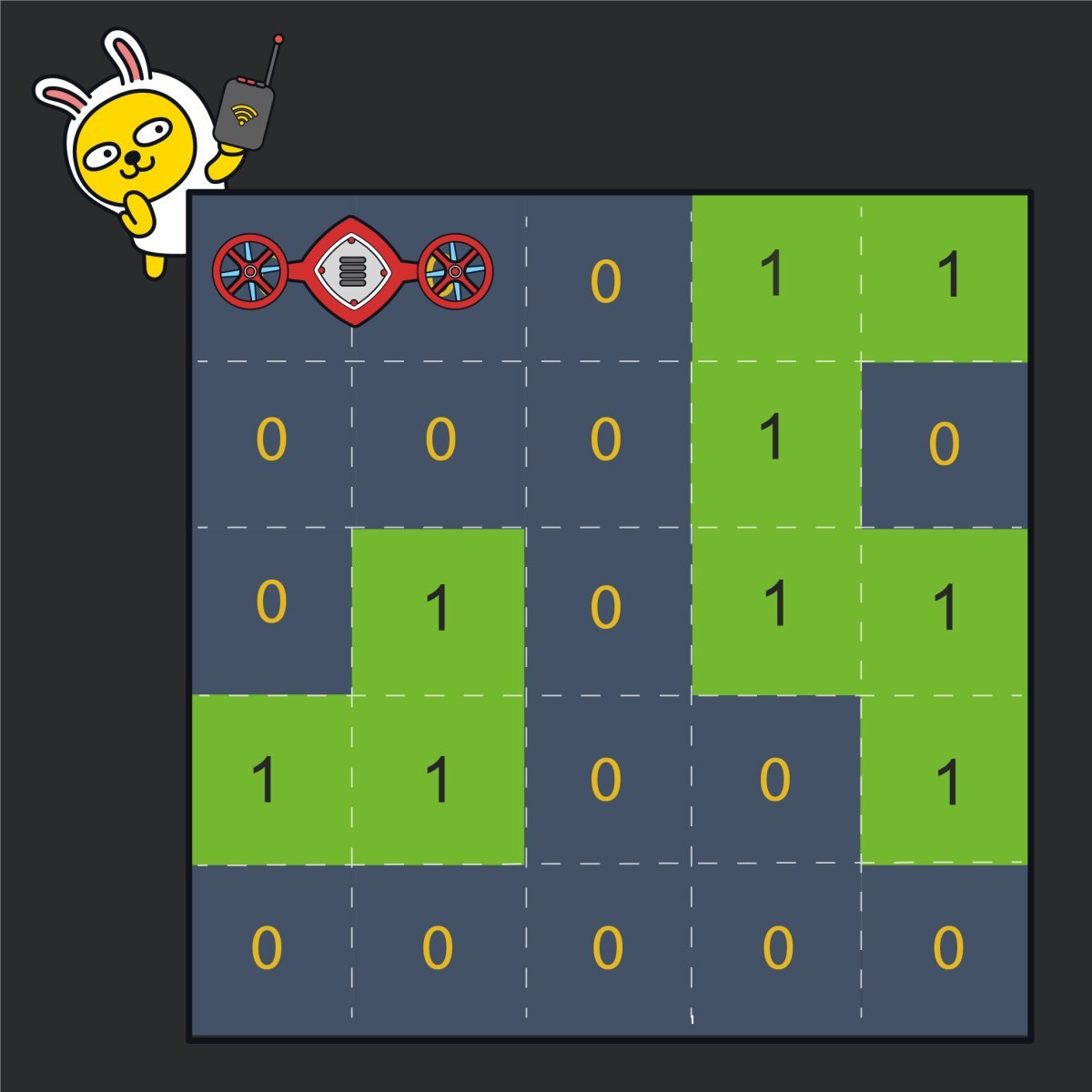 로봇개발자 "무지"는 한 달 앞으로 다가온 "카카오배 로봇경진대회"에 출품할 로봇을 준비하고 있습니다. 준비 중인 로봇은 2 x 1 크기의 로봇으로 "무지"는 "0"과 "1"로 이루어진 N x N 크기의 지도에서 2 x 1 크기인 로봇을 움직여 (N, N) 위치까지 이동 할 수 있도록 프로그래밍을 하려고 합니다. 로봇이 이동하는 지도는 가장 왼쪽, 상단의 좌표를 (1, 1)로 하며 지도 내에 표시된 숫자 "0"은 빈칸을 "1"은 벽을 나타냅니다. 로봇은 벽이 있는 칸 또는 지도 밖으로는 이동할 수 없습니다. 로봇은 처음에 아래 그림과 같이 좌표 (1, 1) 위치에서 가로방향으로 놓여있는 상태로 시작하며, 앞뒤 구분없이 움직일 수 있습니다.