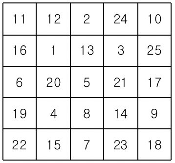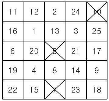 먼저 아래와 같이 25개의 칸으로 이루어진 빙고판에 1부터 25까지 자연수를 한 칸에 하나씩 쓴다