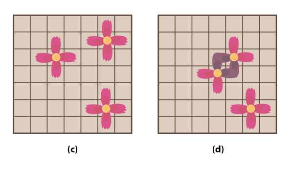 그림(c)는 세 꽃이 정상적으로 핀 모양이고 그림(d)는 두 꽃이 죽어버린 모양이다.