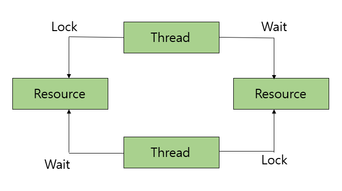 - 모든 스레드가 락이 풀리기를 기다리고 있는 상태, 무한 대기 상태에 빠짐