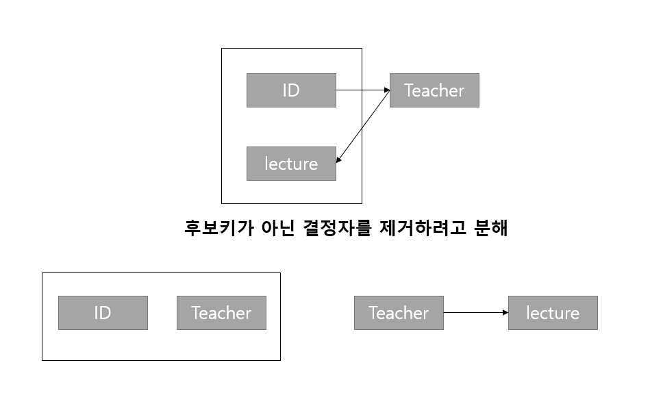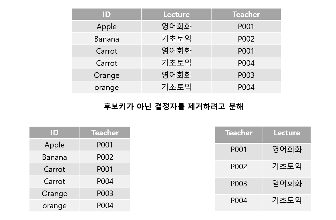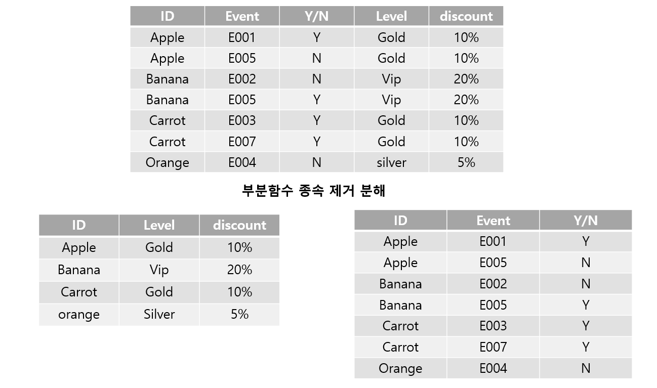- 관련이 없는 함수 종속성은 별개의 릴레이션으로 표현하는 것