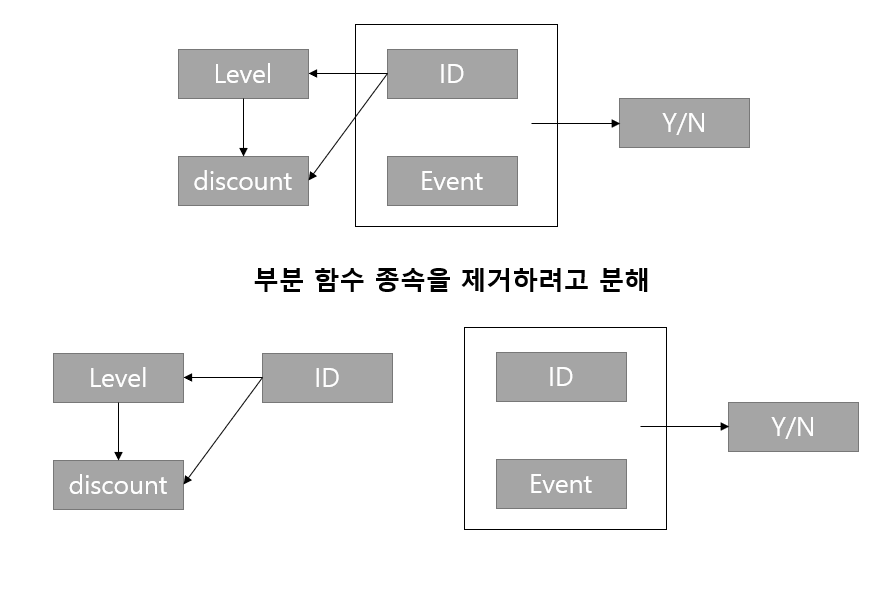 - 제1정규형에 속하는 릴레이션이 제2정규형을 만족하게 하려면, 부분 함수 종속을 제거하고 모든 속성이 기본키에 완전 함수 종속되도록 릴레이션을 분해하는 정규화 과정을 거쳐야 한다.