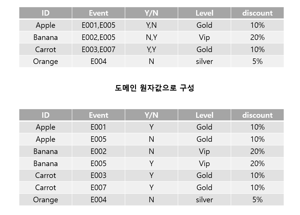 - 제1정규형에 속하려면 릴레이션에 속한 모든 속성이 더는 분해되지 않는 원자 값만 가져야 한다.