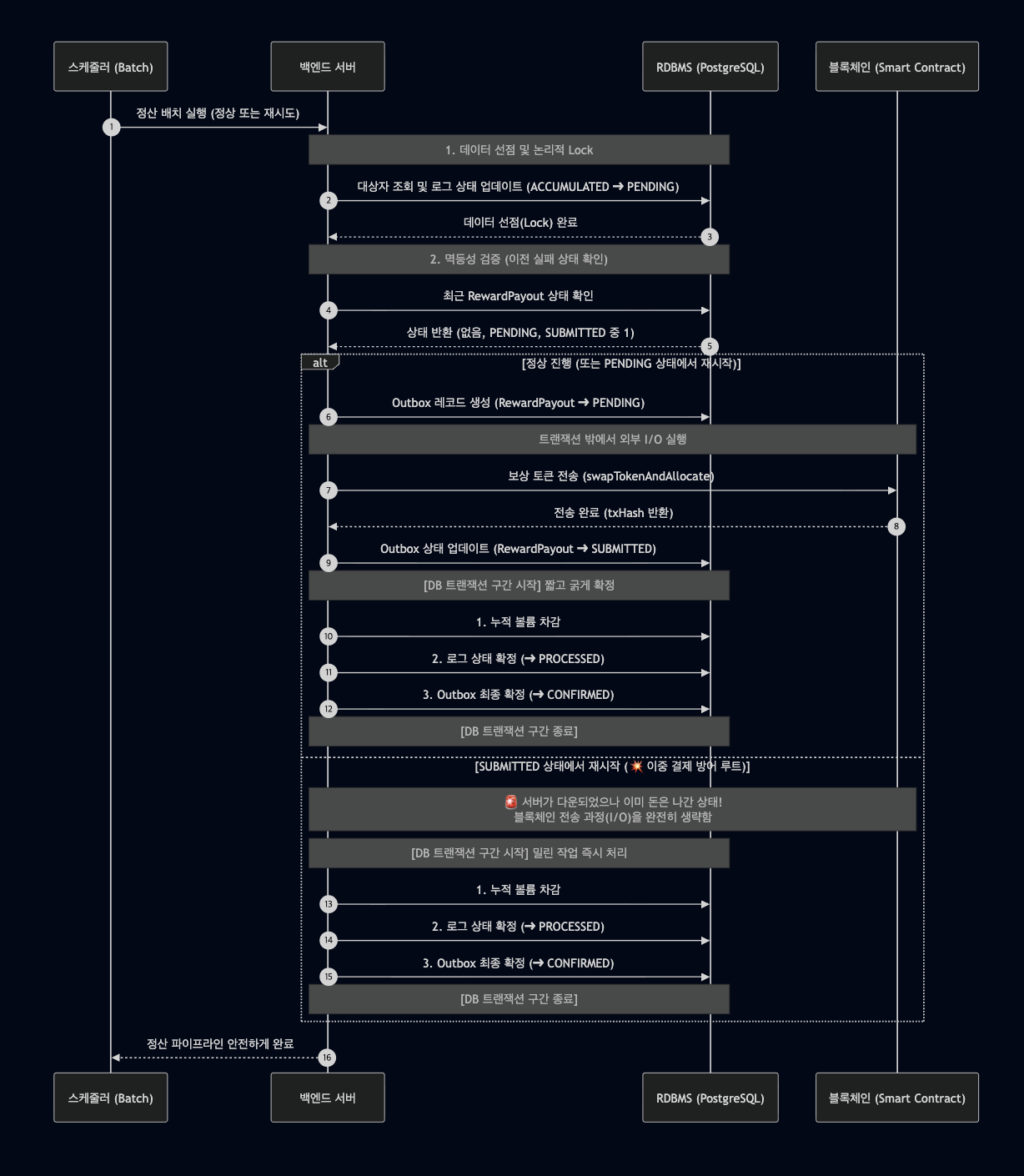 혼잡도에 따라 응답이 몇 초에서 몇 분까지 지연되기도 하고, 뜬금없이 타임아웃이 발생하기도 합니다. 만약 백엔드 서버가 스마트 컨트랙트를 호출해 토큰을 전송해 놓고, DB에 '지급 완료' 처리를 하기 직전 찰나의 순간에 OOM(Out of Memory) 등으로 서버가 뻗어버린다면 어떻게 될까요? 다음 배치 스케줄러가 돌 때, 시스템은 이 유저를 '아직 정산받지 않은 상태'로 간주합니다. 그리고 똑같은 토큰을 또 지급하겠죠. 말 그대로 '돈이 복사되는 치명적인 금융 사고'가 터지는 아찔한 상황이었습니다.